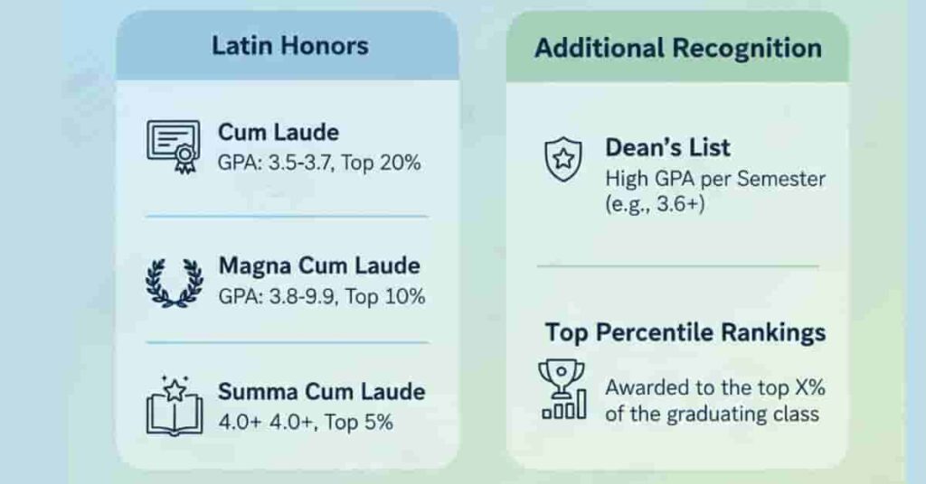 Some universities award Latin honors such as cum laude, magna cum laude, or summa cum laude based on GPA cutoffs or percentile thresholds. These distinctions often reflect class rank indirectly.